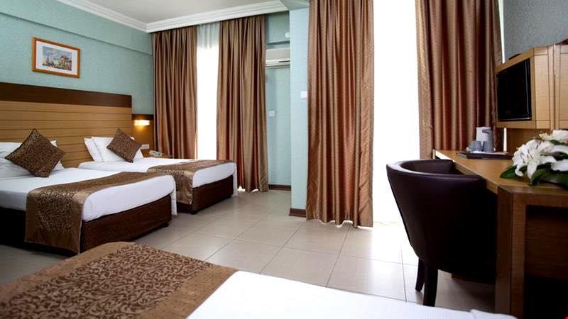 medzinárodného letiska v Antalyi je vzdialený 125 km. Vybavenie: vstupná hala s recepciou, hlavná reštaurácia, reštaurácia á la carte za poplatok, 2 bary, menší bazén s terasou na slnenie s lehátkami a slnečníkmi zdarma, na pláži za poplatok. Osušky nie sú k dispozícii, konferenčná miestnosť, internetová kaviareň, práčovňa, kaderníctvo, kozmetika, lekárska pohotovosť, fotoateliér, bezdrôtové pripojenie na internet a tobogány pre najmenších. Ubytovanie: Štandardne zariadené dvojlôžkové izby s individuálnou klimatizáciou, trezor (za poplatok), SAT-TV, sprcha s WC, sušič na vlasy, balkón,WiFi, minibar. Stravovanie: ALL INCLUSIVE Oficiálna kategória: **** Naše hodnotenie: Mestský hotel s výbornou polohou ponúka nielen pokojnú dovolenku plnú relaxu, ale i krásne scenérie. Rušné centrum plné nákupných a zábavných možností potešia všetky vekové kategórie. Vyznácači hiostórie majú k dispozícií historické centrum len pár minút od hotela. Odporúčame všetkým vekovým kategóriám. |